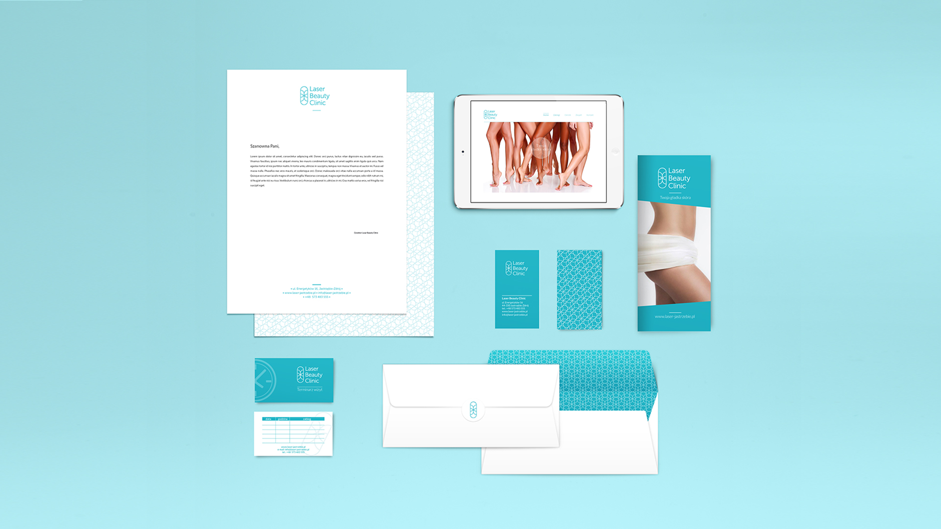 Visual identification for Laser Beauty Clinic – a beauty parlor. The project featured the logotype, brochures, fliers, banners, business cards, and letterhead. The distinctive pattern that appears in the materials has become a theme of Laser Beauty Clinic and can be seen on the parlor walls.