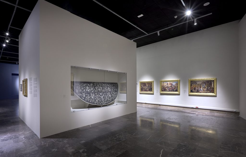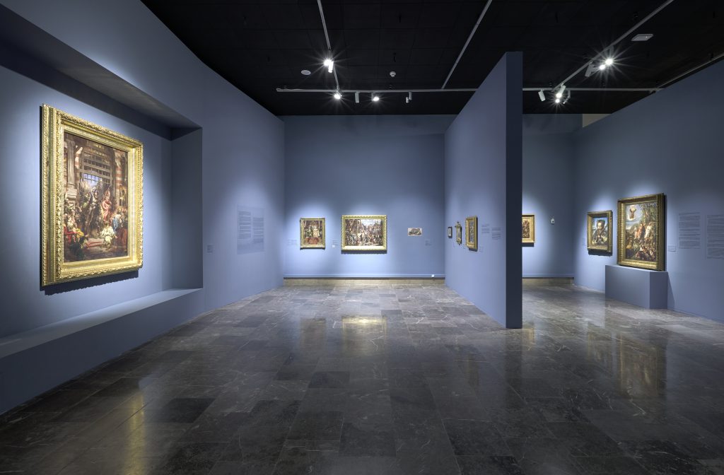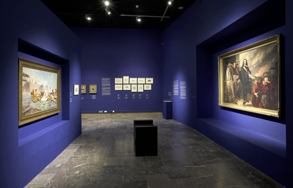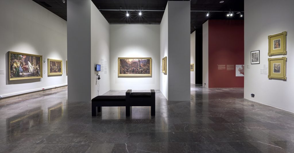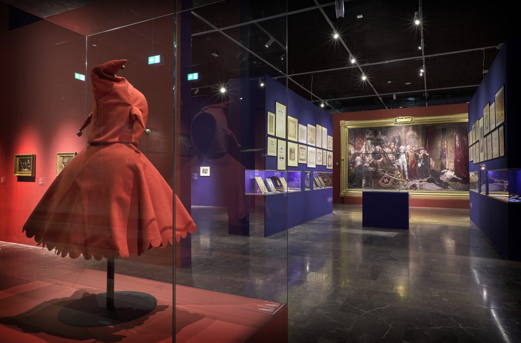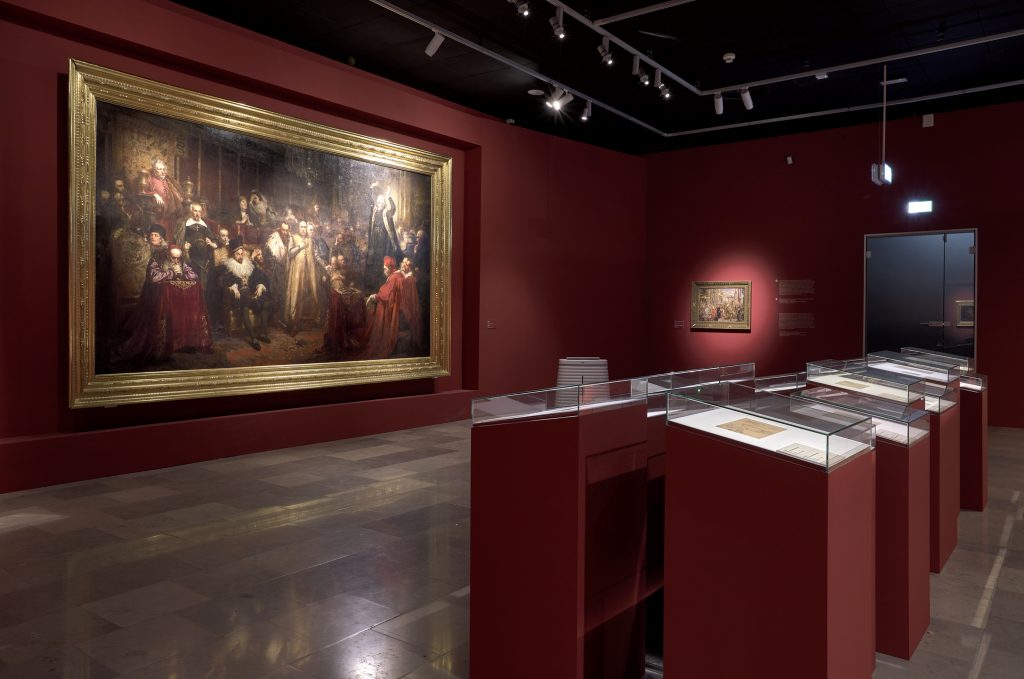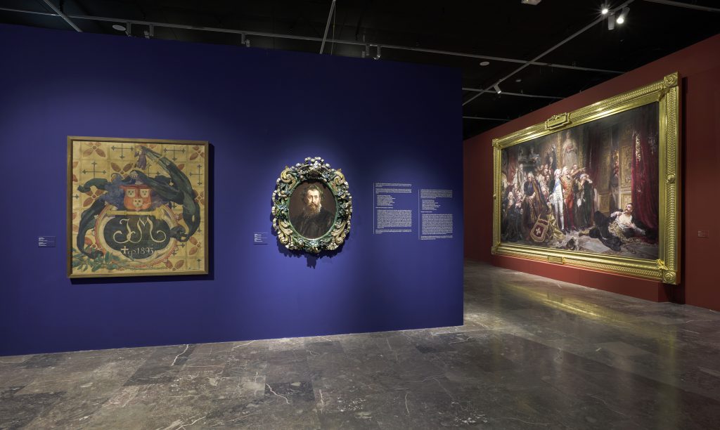 The very first section of the exhibition consisting of props is highlighted, and thus separated from the rest, that focuses more so on artist’s main works. Special niches, constructed in the walls in order to store the more important works, were a continuous element of the arrangement. The exhibition as a whole is designed to lead the spectators in a way they can discover an image of Matejko that is different from one presented in history or art history books.