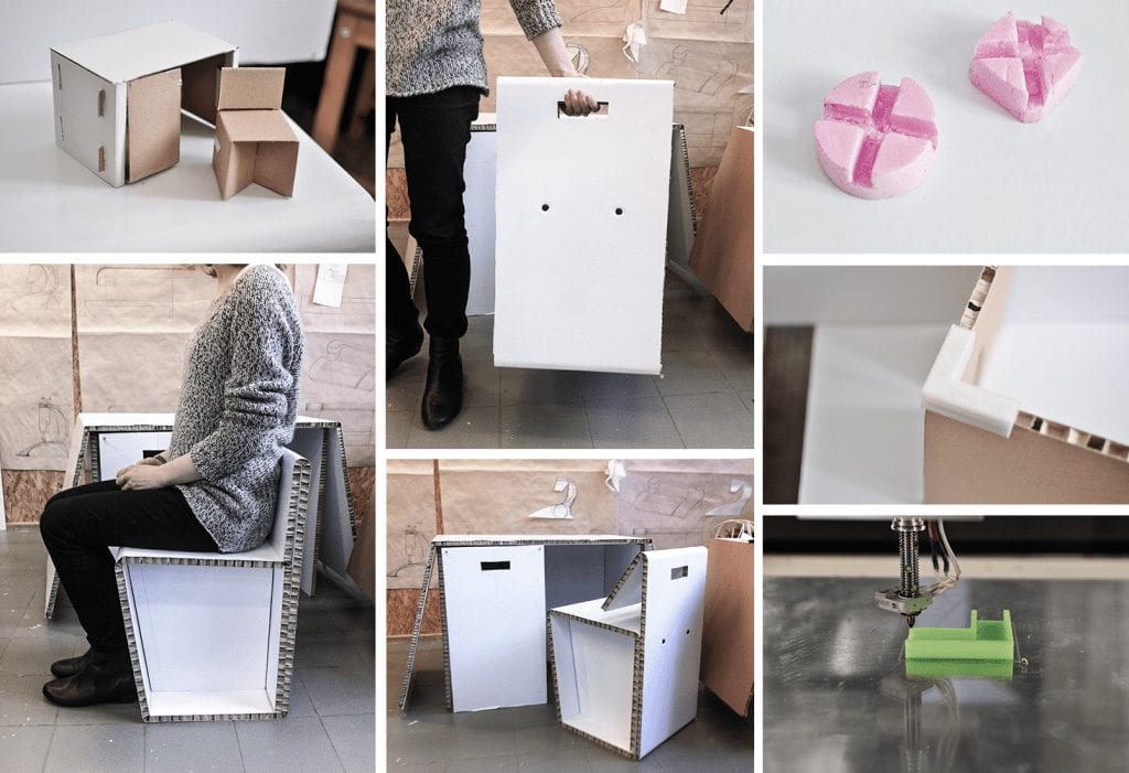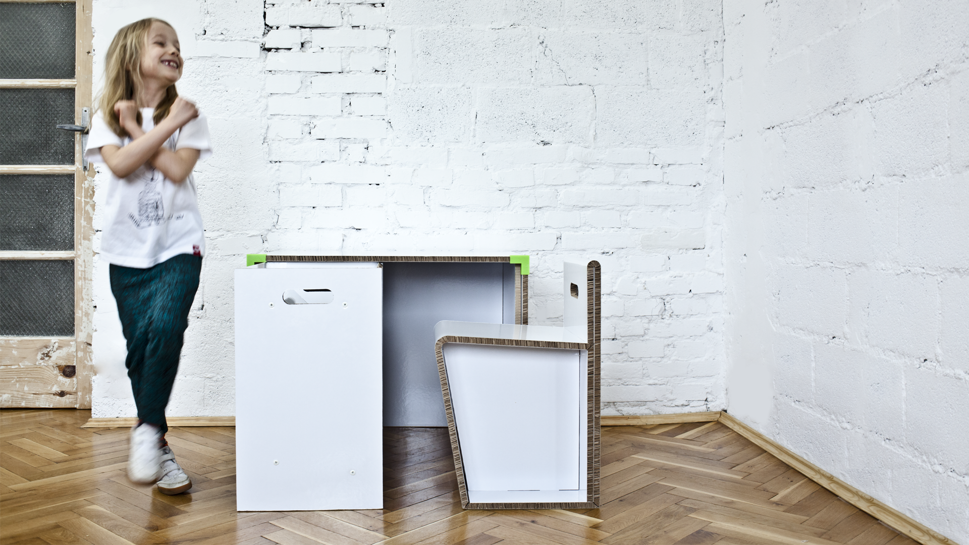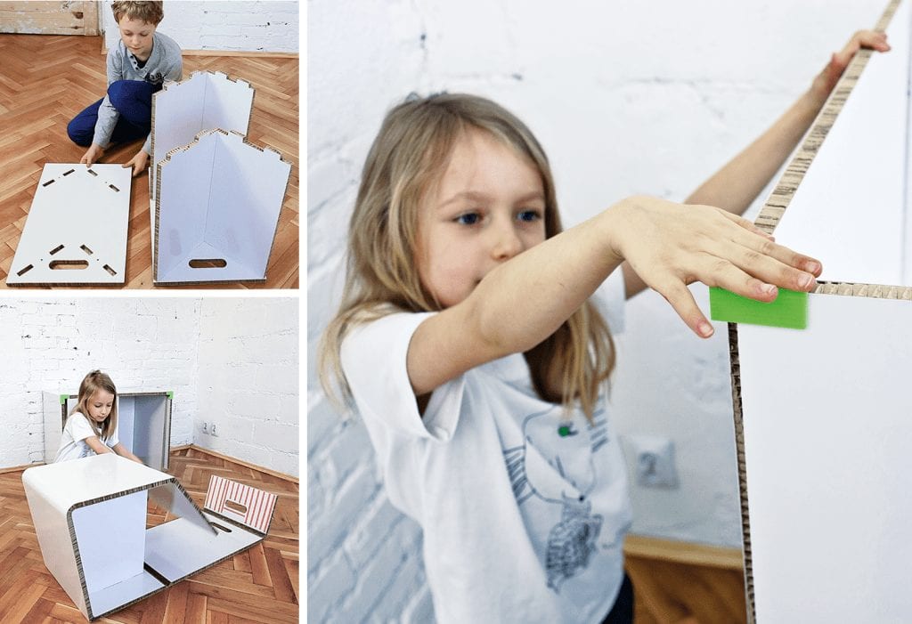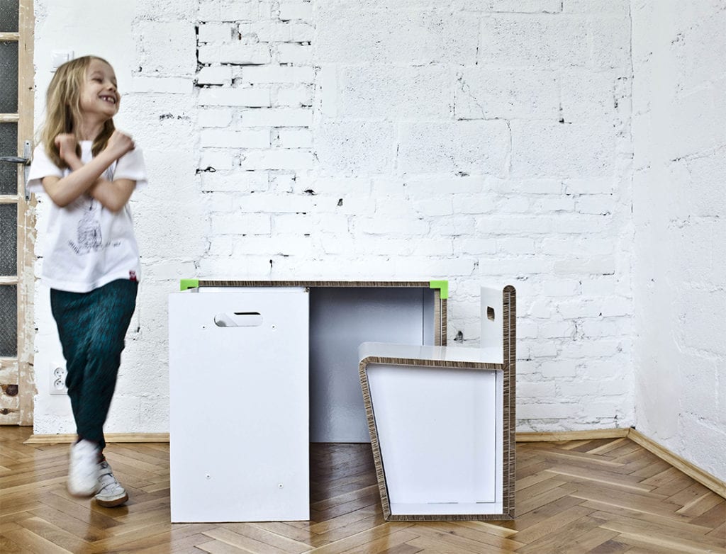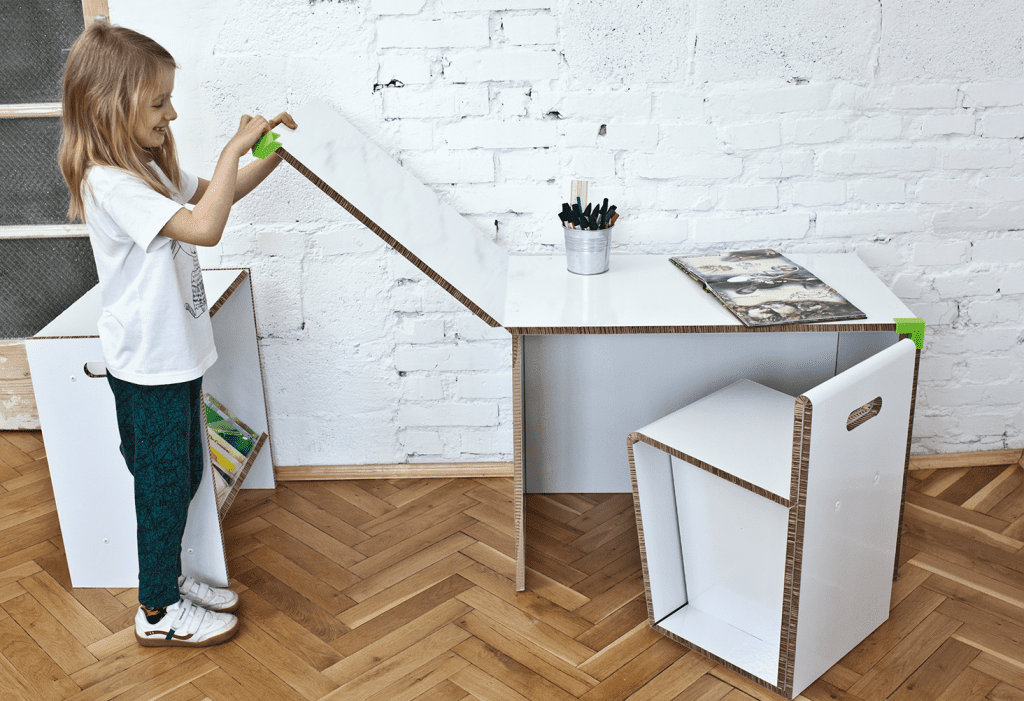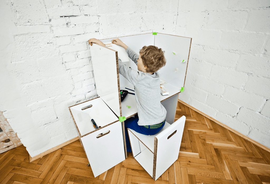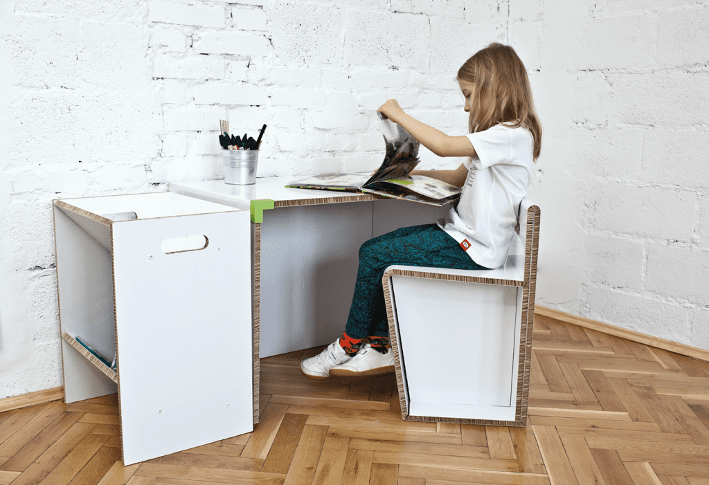 Projekt mebli dla dzieci organizuje przestrzeń do nauki, szczególnie w ciasnych mieszkaniach. Przeznaczony dla grup wiekowych: 7-8, 9-10, 11 -12 lat. W skład zestawu wchodzi: biurko, siedzisko oraz szafka, a także elementy dodatkowe: łączniki oraz śruby. Meble mają zapewnić użytkownikowi własne miejsce pracy, zwiększyć komfort i efektywność nauki. Ruchome blaty dają możliwość częściowego odizolowania, co pozwala na większe skupienie. Meble składane są z płaskiego arkusza płyty re-boardu – lekkiej i trwałej tektury. Materiał pokryty laminatem jest wodoodporny. Łączniki wykonane w technologii druku 3D utrzymują blaty w pozycji pionowej. Montaż oraz użytkowanie mebli jest proste i intuicyjne. Zestaw możliwy do samodzielnego złożenia przez dziecko.