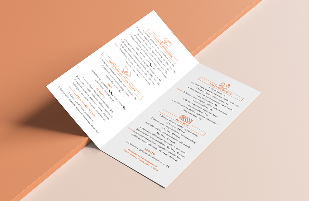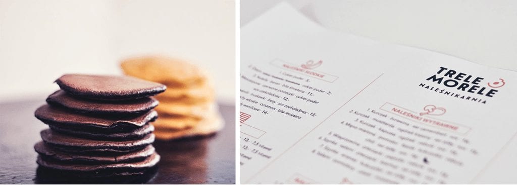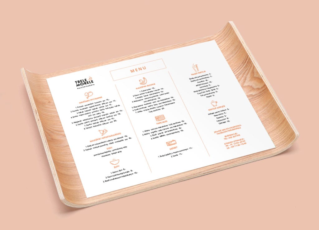 Identyfikacja wizualna naleśnikarni Trele Morele w Jastrzębiu Zdroju. Restauracja specjalizuje się we wszelakich rodzajach naleśników i pancakesów. Głównym założeniem projektu było połączenie świeżego elementu nawiązującego do jednego ze składników naleśników, a także do soczystego wystroju wnętrza knajpy. Projekt obejmował opracowanie logotypu, wizytówek, menu, banerów, witryny, opakowań i toreb na naleśniki.